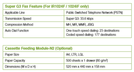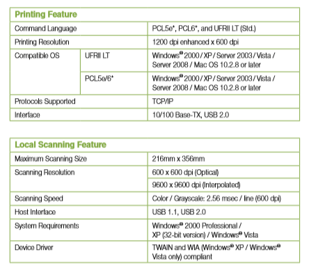 Device yang cerdas dengan Canon's Cutting-Edge Technology untuk modern offices yang telah dioptimalkan untuk kegiatan-kegiatan produktif dengan efisiensi yang cukup baik. Device ini memiliki ukuran yang compact yakni 520mmx457mm. Selain itu, mesin ini sudah memiliki teknologi untuk print double sided. Pada bagian penggunaan energi, device ini mampu mereduksi jumlah energi hingga 5watt dengan energy save mode dan mampu warm up dari sleep mode hanya dalam 1 detik. Untuk penggunaan toner, desain botol tonner sudah menjadi lebih simpel dan lebih mudah direplace sehingga semua orang, maupun awam sekalipun, bisa melakukan penggantian toner dengan mudah. Performa device ini pun cukup baik dengan adanya UFRII LT Technology (Ultra Fast Rendering II LT Technology) sehingga mampu mencetak dokumen beresolusi 1200x600dpi dengan kecepatan up to 24ppm. Device ini juga sangat mudah digunakan dengan kemampuan Copy, Print, Scan, dan Fax.