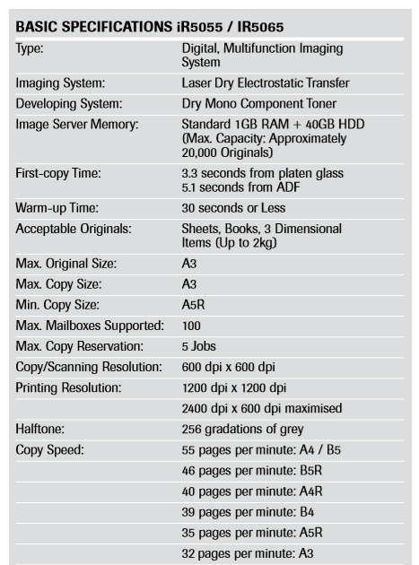 Tipe : Canon IR-5065 Model : Standing Kecepatan : 65ppm Ukuran Kertas : Max A3 Fitur : Copy, Print & Scan Print Warna : Tidak Scan Warna : Tidak Kabel Jaringan (LAN) : Ya Wireless (WiFi) : Tidak USB Print : Ya Resolusi (Print / Scan) : 600x600 dpi Ketebalan Kertas : Hingga 216 Gram Kapasitas Cetak : 250.000 lembar/bulan Kapasitas Toner : 20.000 lembar/kg A4 (refill) Daya Listrik (Dari PLN) : 2200 Watt Daya Yang Dipakai : 800-1200 Watt