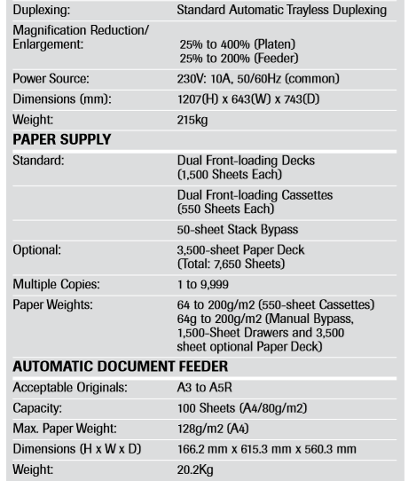 Mesin ini sangat cocok untuk usaha fotocopy, karena disamping kecepatan tinggi, namun performa lebih unggul daripada tipe-tipe medium lainnya. Dilengkapi dengan Duplex Automatic Document Feeder (DADF) menjadikan device ini sangat efisien untuk melayani konsumen atau untuk kebutuhan di kantor anda. Fotocopy dalam jumlah banyak tidak perlu repot lagi buka dan tutup pintu. Fitur lengkap dari mulai Fotocopy, Print Hingga Scan Warna sudah disematkan pada tipe device ini. Dengan kecepatan 65 ppm mesin ini tergolong mesin kecepatan tinggi yang sangat cocok untuk membuka usaha fotocopy. Dijamin tidak akan ada antrian pelanggan di toko anda dalam keadaan ramai. Jika anda mencari mesil bandel, ini salah satu dari beberapa type yang bisa dibilang bandel karena mampu mencetak lagih dari 250.000 lembar perbulan.